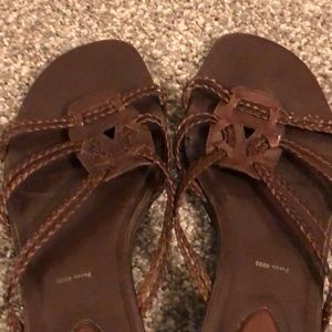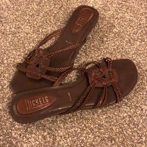 Women’s slip on brown sandals with small heel. Fun braided detail across the front of the shoe! Very comfortable to wear!