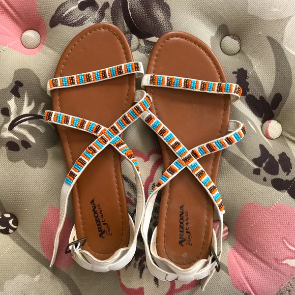 White strapped, flat sandals with beaded straps of orange, turquoise, and bronze. Worn once, uncomfortable for my feet is all:)