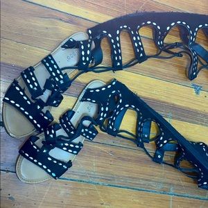 Nice sandals for women, go up to the knee , can go right with skirt , dress, shorts , very comfortable! Size 8 black and gold