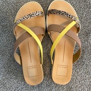 Brand new never worn outside. Bottoms have some dark spot from wearing indoors. Animal print, yellow, tan straps. Fake leather material. Dolce vita brand size 6.5
