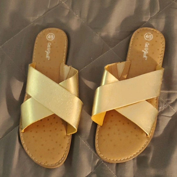These are gold slip-on sandals! Good for summer