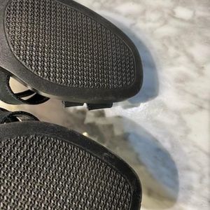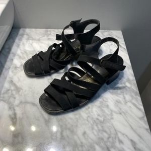 Selling a pair of black suede Riker brand sandals in very good condition size 38 shows a little bit of the name wearing off on the inside and minor scratches at the tips see photos $36