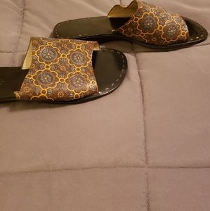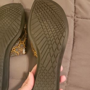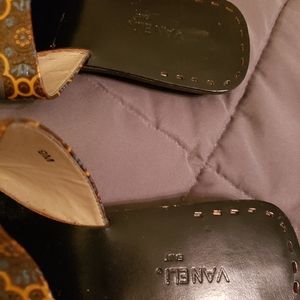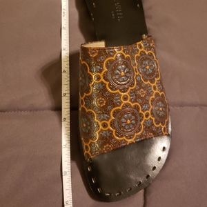 Gently used VANELI East slider sandals. Wooden sole, rubber on the bottom. The tops have unique details of brown, gold and navy. Please see pictures. Great summer shoe! ☀️