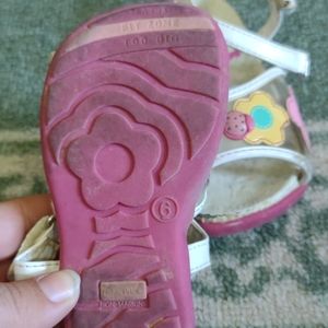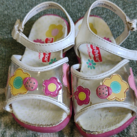 Open toe sandals with flowers and a ladybug. Velcro