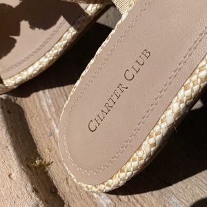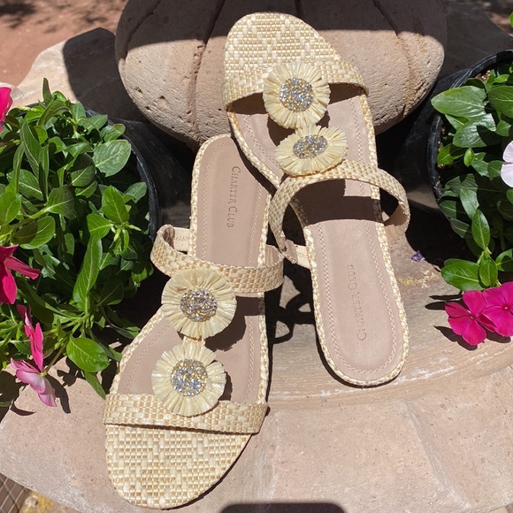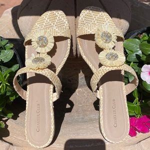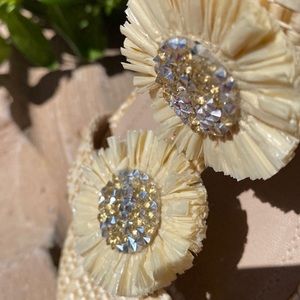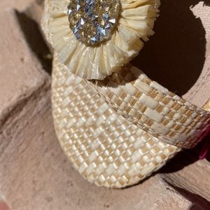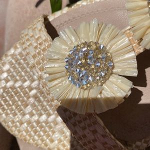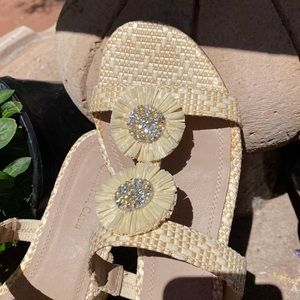Cream colored straw like weave sandals. Two decorative flowers on each sandal, embellished with crystal like bead work. Beautiful summer sandal. Look brand new. Worn once for about 2 hours !! 🌺