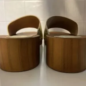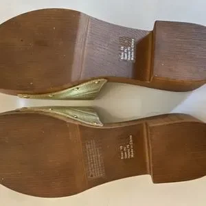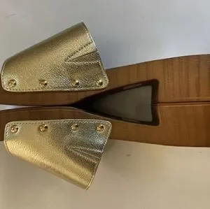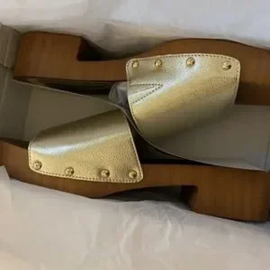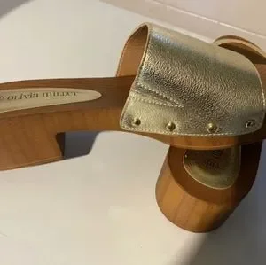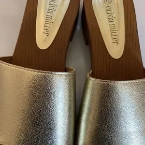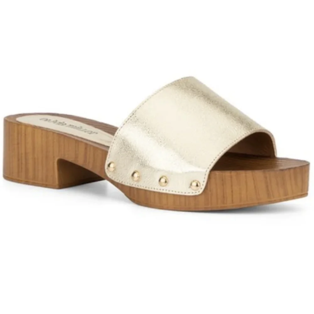 Olivia Miller Wooden clog sandals with Sleek gold strap and gold snap