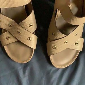 Tan leather upper sandals. Lightly worn. Size 7.5M some wear on them.