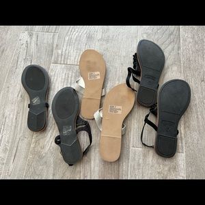 These cute straps sandals are in great condition! Worn once. The ones to the left have adjustable straps, the silver middle ones are slip one, and the black to the right are stretchy adjustable!
