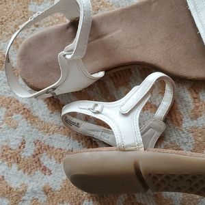 White sandals with adjustable straps, so comfy, the Aerosole comfort! great shoes.