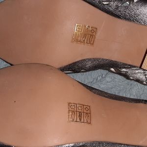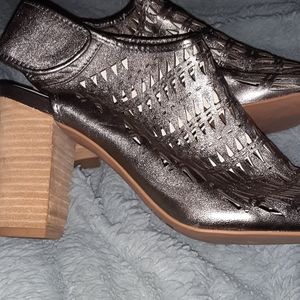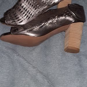 Sandals/shoes with cutouts, 7 1/2" heel. Velcro heel strap. The color is actually Pewter. Round toe worn once in my house. Bought the wrong size. Waited too late to return.