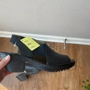 Black open toed, heeled sandals. Size 7.5. Never worn.