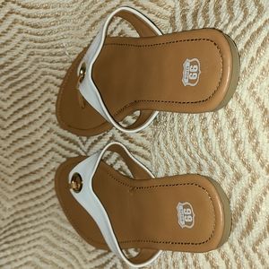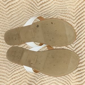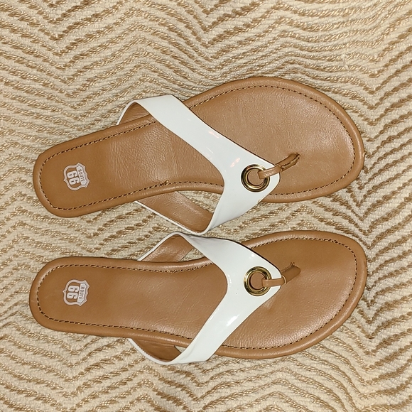 white and tan route 66 sandals. comfy casual flat. dress up a pair of jeans or to wear to work! barely worn