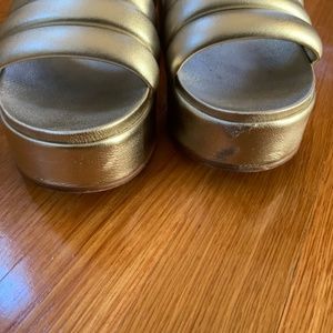 Gold j slides size 8. Great condition other than a scrape in the front of the left shoe. See picture