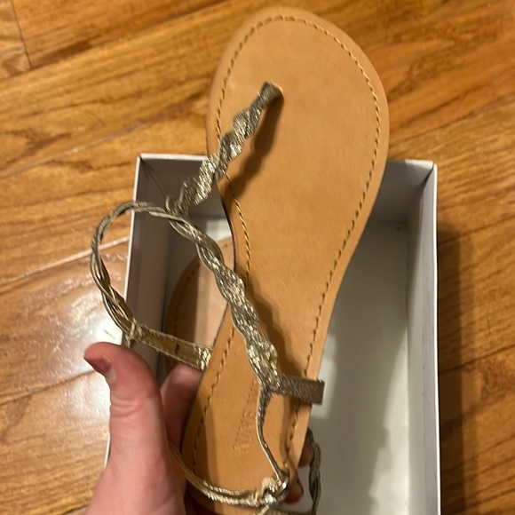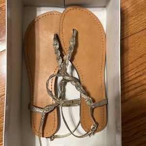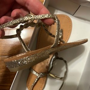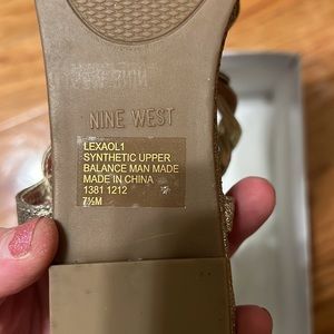 Champagne glittery Nine West t-strap sandals. Never worn. Women’s size 7 1/2. Buckle heel closure with twisty top. With box, but not original