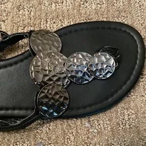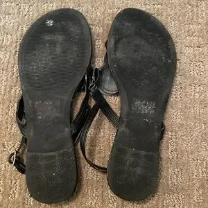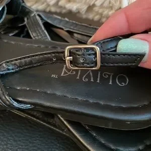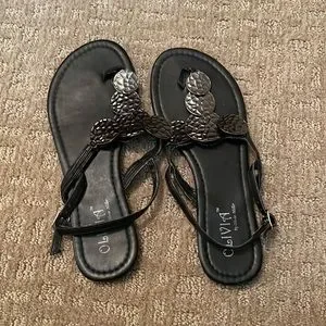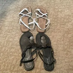 Olivia by Olivia Miller black sandals, size 7-8, gun metal hardware, strap at ankle is adjustable. Echo Bay white sandals, size 7, elastic behind will stretch. Both I lovingly wore but they still have wear in them