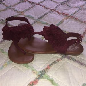 Women’s sandals size 6. Burgundy ruffle. Gold buckle. Worn twice.