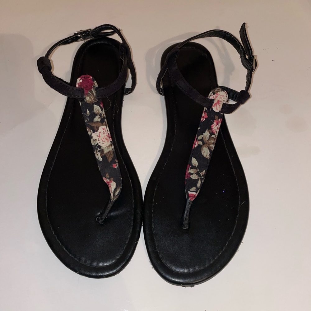 Spring or summer Sandals. Flower design on the top with a ankle strap attached. Very comfortable and cute for warm weather.
