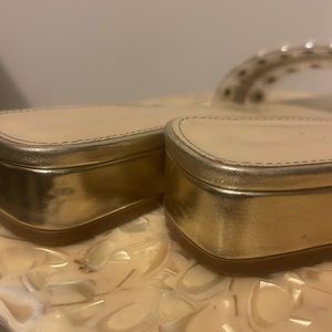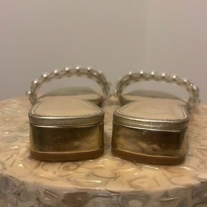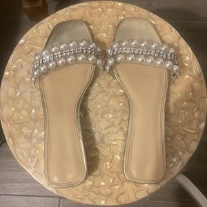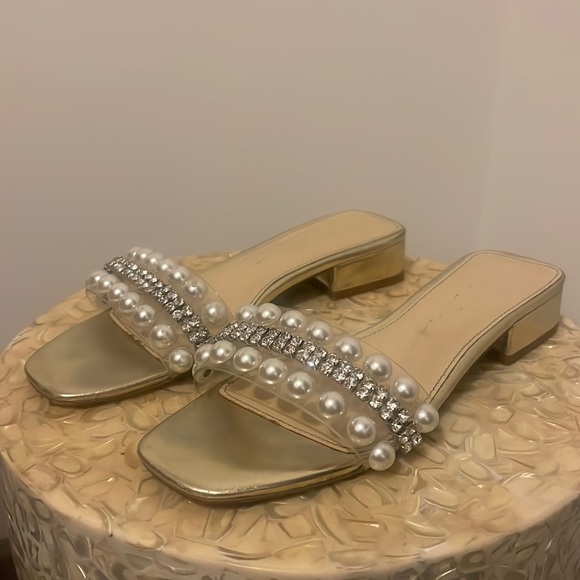 Betsey Johnson gold sandals with pearls and rhinestones. Beautiful. They elevate any casual outfit. Love to wear them with jeans and a white tee. Or a white Flowy dress.