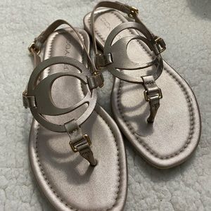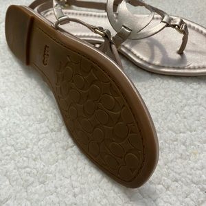 Coach rose gold color. Coach logo on center. Flat sandals. Comfortable. Excellent for hot weather.