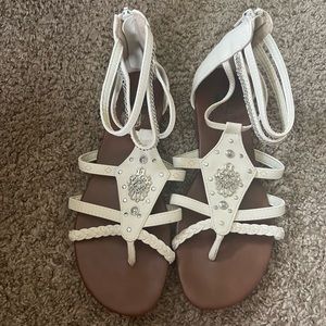 Flat sandals with ankle straps, white color with silver design. Worn once or twice- excellent condition…. And they zip up in the back. Clean home no smoking!!!!!!