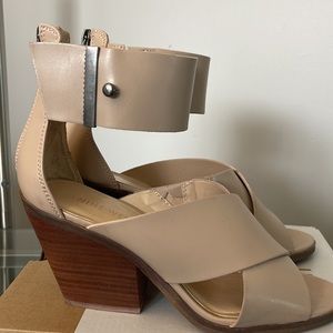 Nine West Sandals man made upper. Wide cross strap with zipper in the back. Nude/ neutral color. Excellent condition