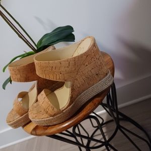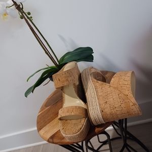 4 1/2 inch wedge sandal. corkscrew material. Never worn. If you're looking for a little extra height, these are the sandals for you. Cute and versatile. Runs small. I wear an 8.5, and they fit me