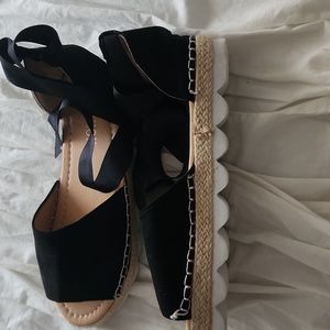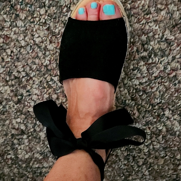 black cloth material slip on esprillas. has black ribbon that ties around ankle.