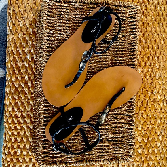 Black leather thong sandals with jewel accents