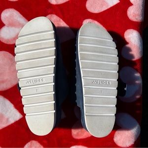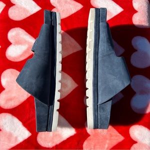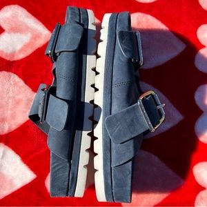 J/Slides nyc, size 7, platform slip on blue sandals. Buckle strap for custom sizing. Like new, used with minor wear, Smoke free home.