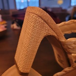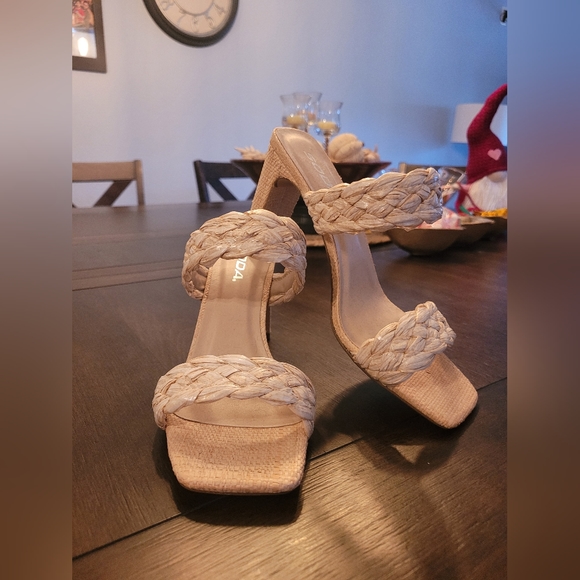 Soda sandals, tan, braided, never worn. Size 8 half. Great with jeans or dress them up in a dress. 3 inch heels