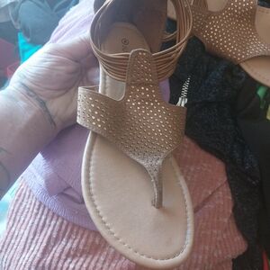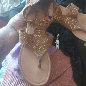 tan sandals with rhinestones on the tops of them