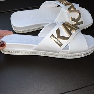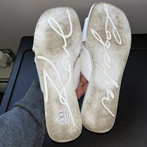 My daughter wore these once on vacation you can’t even tell that these had been worn expect on the bottoms great great condition I have a pair and they are the most comfortable sandal I own love the rhinestone detail along the shoe and the gold hardware