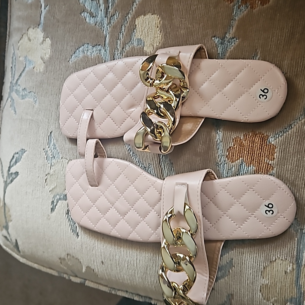 light pink sandals with gold chain adornment