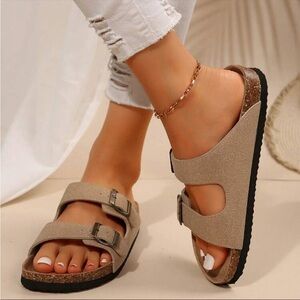 Slip on sandals with adjustable buckle straps. Cork bottom. Color is a little lighter in pics. NWT
