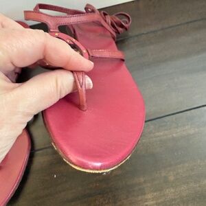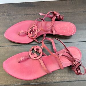 Rare Vintage Gucci sandals in the most special deep pink color. Size: 37 they wrap around your ankle. All leather & have a slight nick on the right tip of the sandal. Easy to repair. They also have small gold grommets around the GG.