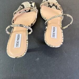 Thin stretch 2 strap sandals, kitten heels. Snake reptile pattern tan/beige/black/gold neutrals