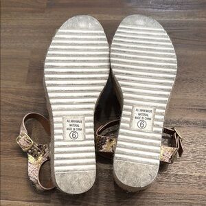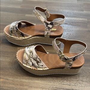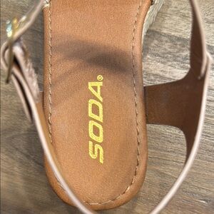 These Soda sandals feature a stylish brown & gold snake skin print with a comfortable espadrille-style sole. The ankle strap with buckle closure ensures a secure fit, while the open-toe design adds a touch of casual elegance. Perfect for spring and summer, these sandals combine fashion and comfort effortlessly.