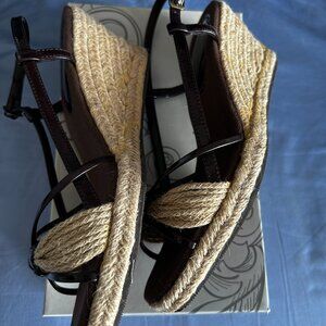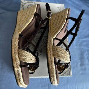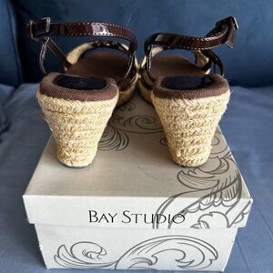 Pretty sandals by Bay Studio in brown patent (?) and juke sole, strap and heel. There is a rubber sole under the toes and the heel. Size is 8 1/2 with a 3 inch heel. Worn 1x so they are in excellent condition and in original shoe box.
