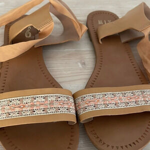Flats with a neutral color base and ribbon laces to wrap the ankle. Pre loved (wore 3x) with lots of wear left. Fits true to size.
