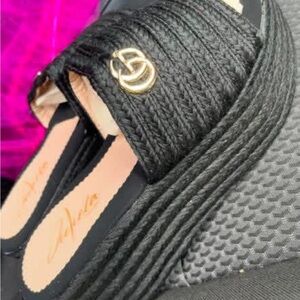 Step up your style with these elegant black platform slides. Perfect for any occasion, these shoes offer both comfort and sophistication. Size 6. New in bag. Never worn. Gold logo on them. Will match everything. Boutique bought. Paid a lot.