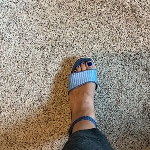 Cute two toned espadrille sandals. 2.5” heel but flat insole. Velcro ankle strap. Worn once. Wear with shorts, summer dresses and jeans. Comfy and casual. No stains, tears or wear and tear.