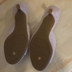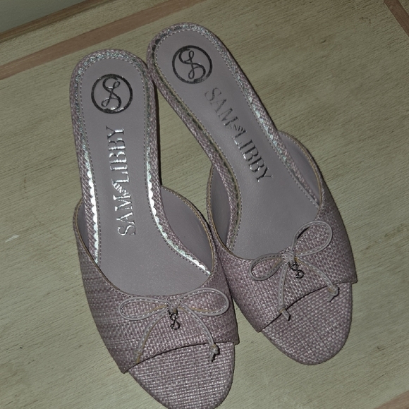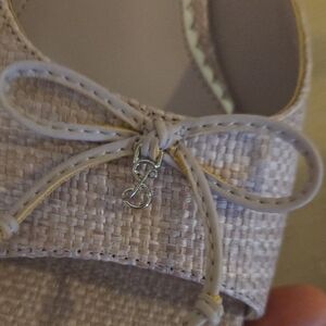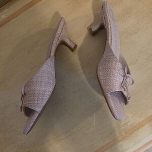 pink woven slide sandals with a decorative bow. Lightweight and breathable woven upper for everyday wear. Slip-on design offers easy on/off comfort. Subtle metallic logo charm for a refined touch.
