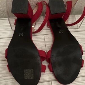 Stylish red platform sandals with a bold design. Perfect for adding height and flair to any outfit.