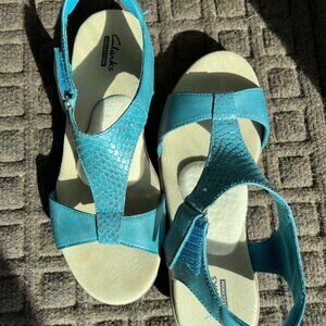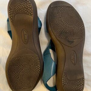 Pretty teal blue sandals with reptile accent. Worn only a couple of times. I added an adhesive arch support for my bad feet which can be removed before shipping or can be left in for you to try. Comfortable sole. Questions? Let me know. Make an offer!