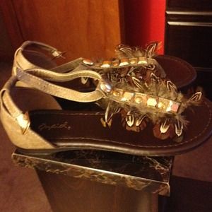 T-Strap sandals w/feather and gold detail! Never worn, someone bought them as a gift and they're too small.