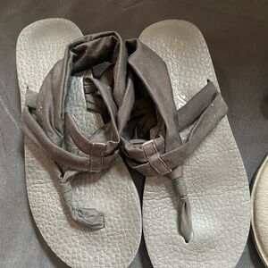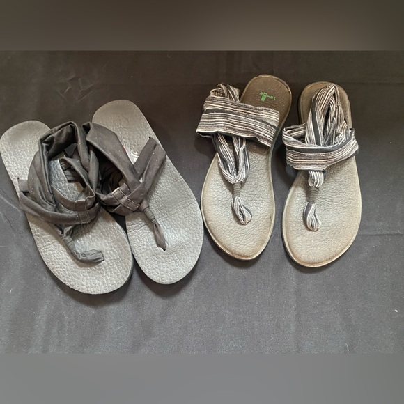 Comfortable and stylish sandals bundle in black and gray. Perfect for everyday wear. These have been worn but are still in great condition. I am a 8 to 8.5 size in women’s and these fit perfectly. One is an Sanuk brand and the other is sketchers memory foam. See pictures for details!
