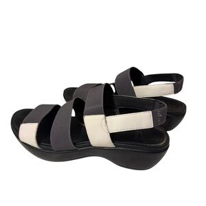 Size hese chic gray and white sandals. Perfect for any occasion, these sandals offer both comfort and elegance. Easy to fit in and out. Perfect conditions just frot of the shoes have some scrubs which is very miner not noticeable