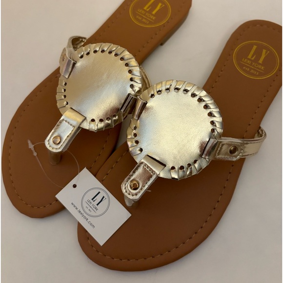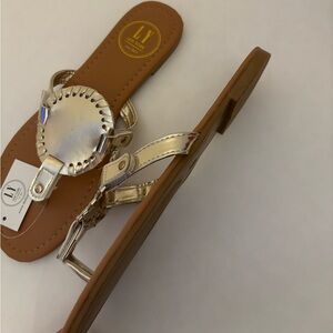 Gold with changeable disks (turquoise), size 8, never worn, flat sandal