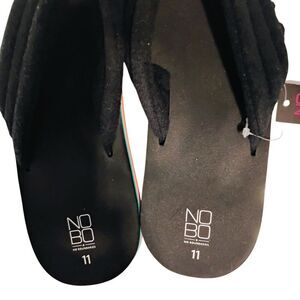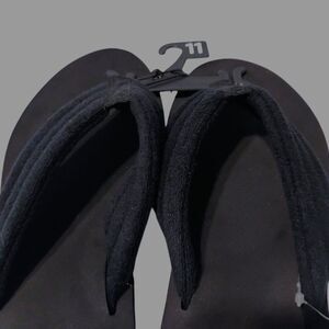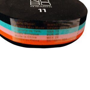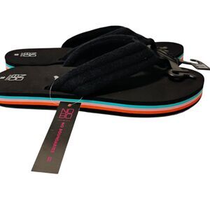 Really comfortable and cute striped foam platform sandals. They are an even 3/4" platform from toes to heels. The thongs straps are covered with black terry cloth fabric. They have a very 90s does 70s vibe. So retro and fun. Teal, pink, coral and black. Black footbeds and outsoles. Brand new with tags attached. Never worn. In excellent new condition with no flaws.