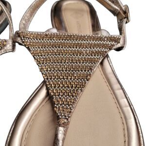 Sandals Gold Rhinestones And Studs Leather Flip Flops Antonio Melani Shoes sz 8 in EXCELLENT condition! These are the perfect shoes to add a little sparkle to any outfit. Also great as a shoe change at the end of the night when the heels are getting to be too much just put these on they are still fancy! Cushioned insole. A little peeling of the leather and only one missing rhinestone. Barely noticeable. See photos for details.